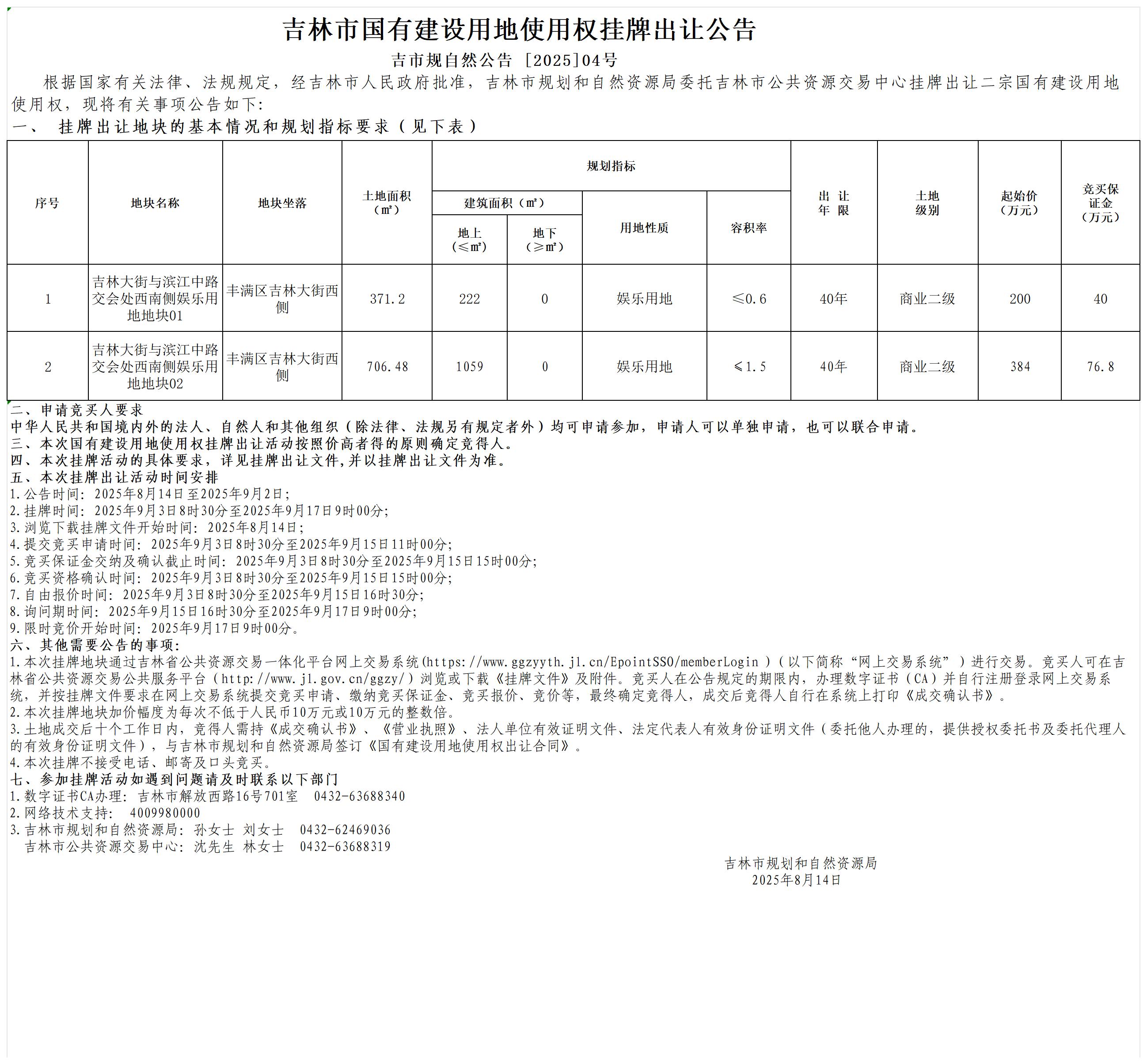 吉林市国有建设用地使用权挂牌出让公告(吉市规自然公告 [2025]04号)